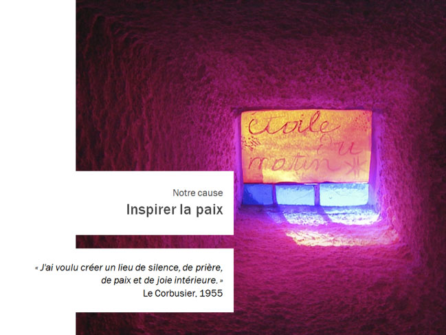 • Si notre lieu marial est chrétien, la conception de Le Corbusier nous invite à l’intériorité dans un espace de célébration épuré, avec une iconographie discrète mais présente, par des mots, des images, des couleurs, des signes liturgiques.