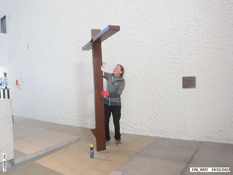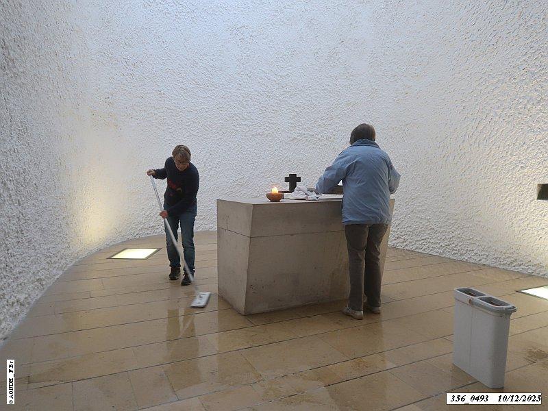 Hier, une dizaine de bénévoles ont préparé la chapelle avant Noël : Grand ménage après le nettoyage au laser de la coque, démontage de l’exposition photo extérieure et ouverture de l’horizon avec la coupe d’un houx dont les boules rouges égaieront les intérieurs durant les fêtes de fin d’année.